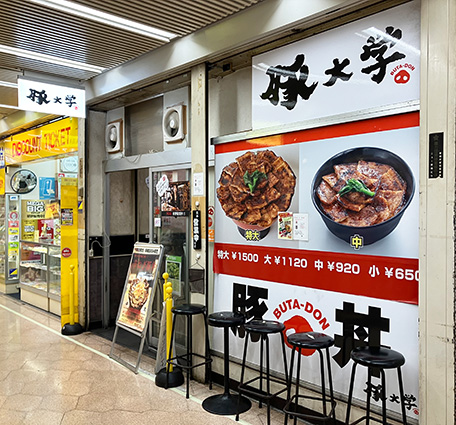 豚大学は新橋駅の目の前にあるニュー新橋ビルの1階にある豚丼の専門店です。豚丼は小:500円、中:650円、大:810円、特大1,020円があります。特大は総重量1kgだそうです。私にはとても食べられそうにありませんでしたので、大を注文しました。