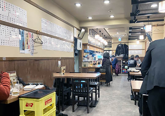 そんな「真澄」は1階が店舗、2階が自宅という形態でしたが、一度、1989(平成元)年に改装し、店内が広くなったそうです。しかしながら建物の老朽化に伴い、店舗を建て替えることになり、2019年3月1日で一旦、休業となりました。その後、5階建てのビルに建て替えられ、「真澄」はその1階に店舗を構えています。2020年4月1日から再開した店内は、以前あった小上がり席をなくし、テーブル席とカウンター席のみですが、以前よりも席数は増えたそうです。暖簾は昭和の時代、ご近所の「田原屋」に注文したものを使っているそうです。白色以外に2枚、色違いで合計3枚あり、10万円以上するそうです。