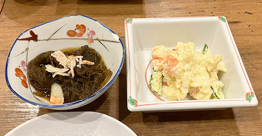 魚介類の調理は茂夫さんが担当し、他のメニューは晴江さんか茂夫さん、その時に手が空いている方が作るそうです。晴江さんが結婚した当時にあったメニューは、ふぐ、鮪、鯵、タコ、イカ、おでん、おしんこ、ライスくらいだったそうです。晴江さんが来てから、家庭料理のようなメニューが増えていったそうです。