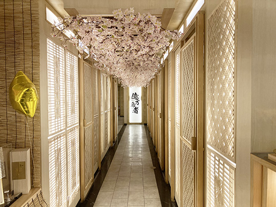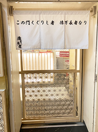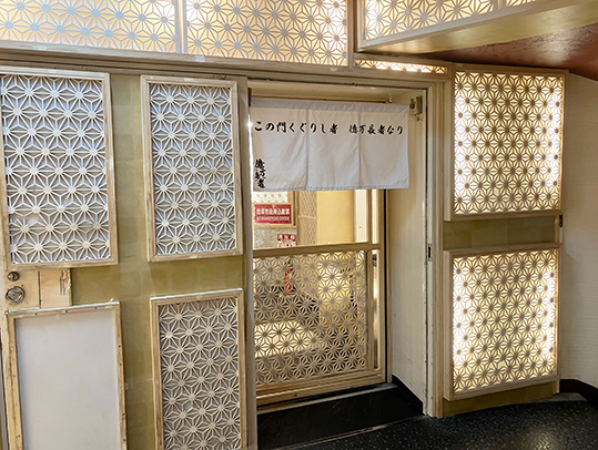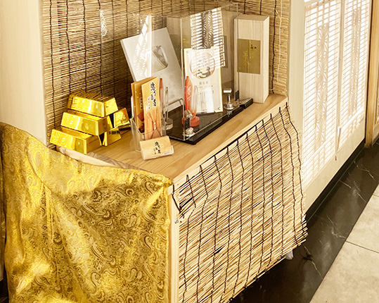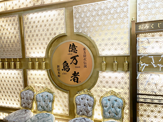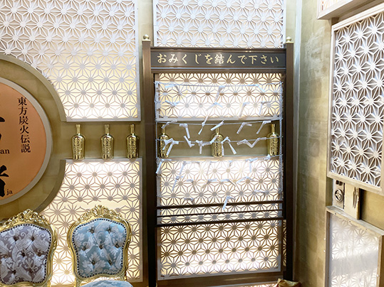 ビルの4階にありますが、エレベーターに乗るための階段に派手な看板があります。エレベーターで4階に到着すると金色の派手な装飾のお店があります。入口には「この門くぐりし者 億万長者なり」と書かれていて、ワクワク感が高まります。横の壁は、釘や接着剤を使わずに木片を組み合わせて幾何学模様を作る日本の伝統技術を用いた「組子細工」の壁飾りになっています。椅子も金ピカで、何故か、おみくじを結ぶ場所がありました。