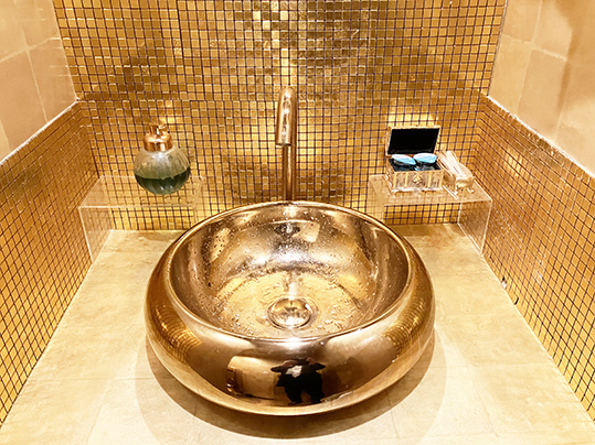 店内は個室になっていて、落ち着いた空間です。ちなみに便所の便器も金ピカで、洗面所も金ピカでした。「億万長者」扱いかは分かりませんが、非日常空間であることは間違いありません。ここまで「普通ではない」居酒屋はなかなかありませんので、いつもと違う雰囲気、気分を味わうことができます。