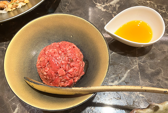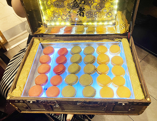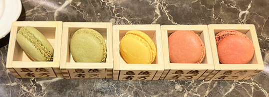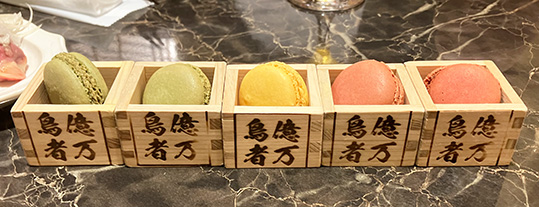 テーブルの上には小さな升が置いてあって、店員さんに「これは何?」と聞いたら、『後で使うので、お待ちください』と言われました。最初に注文した飲み物が提供され、A5和牛の生ハムてんこ盛りが提供された後、店員さんが立派な箱というか鞄のようなものを持ってきて、『開けますよ。いいですか?』と言うので、慌ててカメラを起動させて写真を撮ったら、中には3種類のマカロンがありました。これが御通しだそうです。マカロンは「フランボワーズ&コーンビーフ」、「抹茶&チーズ、「レモン&あんこ」の3種類で、1人ずつ選ぶと、先ほどの小さい升に入れてくれます。