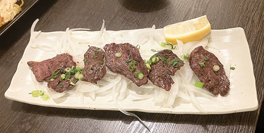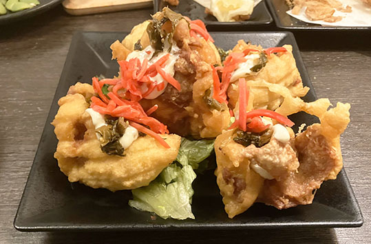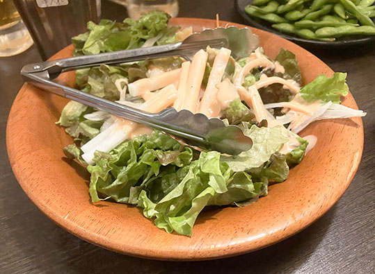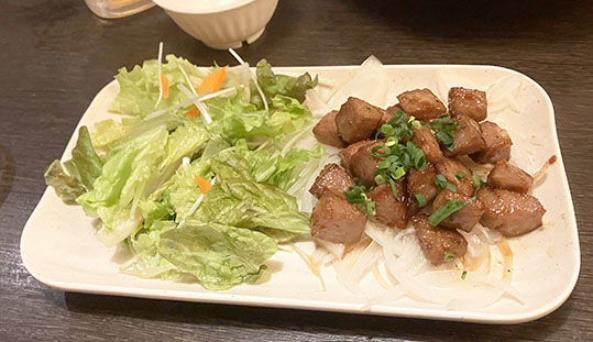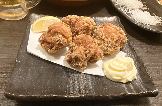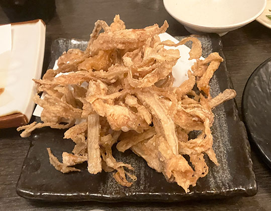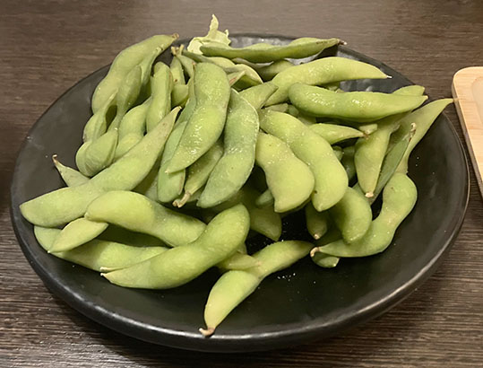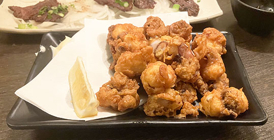 最初に出されたのは、貧相な枝豆でした。これがメニューでは「本日の前菜」です。嘘偽りではないですが、枝豆と言えば良いですよね。サイコロステーキとされる料理は、ステーキではなく、合成肉でした。金額の割に貧相な料理でしたが、料理は30分くらいで全て提供されました。追加で何品か注文したのですが、どれも残念な感じでした。唯一、美味しかったのがタコの唐揚げでした。