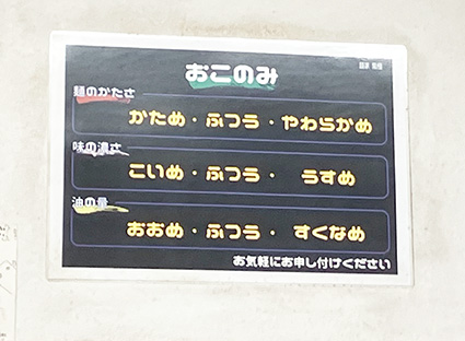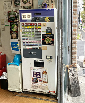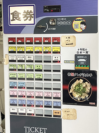 お店に行ったのは1時半過ぎだったのですが、6人の行列ができていました。私の前を歩いていた人が、列を無視してお店の入口右側にある食券機で食券を買って、それから列に並んだので、真似をしました。行列に並んでいると店員さんが来て、前の5人の食券を回収しながら好みを聞いていました。食券を回収された人たちは2〜3分で店内に入っていきました。
