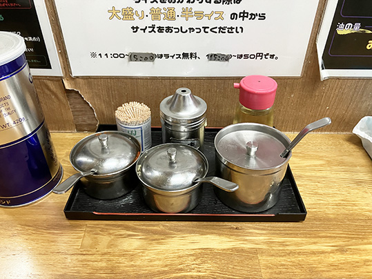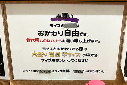 私はラーメンと「まかない飯」を注文しました。驚くことに、昼の時間帯は御飯は無料でいただけるそうです。しかも、ライスはおかわり自由だそうです。おかわりする際は「大盛り」、「普通」、「半ライス」から選べるそうです。お代わり自由なら、学生さんにはありがたいお店です。最近のお米代が高い、という時代に、素晴らしいサービスです。