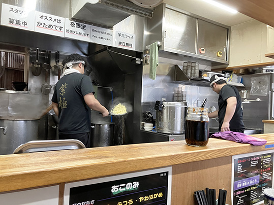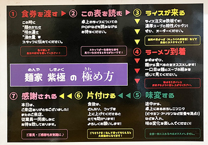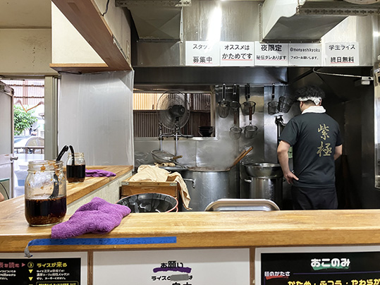 店名の「紫極」は「しごく」ではなく、「しきょく」と読みます。「紫極(しきょく)」とは聞きなれない言葉ですが、「(天帝の居る所の意味の「紫微垣(しびえん)」から)天子の居所。禁中。紫禁。」という意味の言葉です。荒井さんは、この言葉から「紫極という言葉は神より上の存在、天上の最高神という意味があるので、みんなに愛されるラーメン屋になりたい」という思いで名付けたそうです。