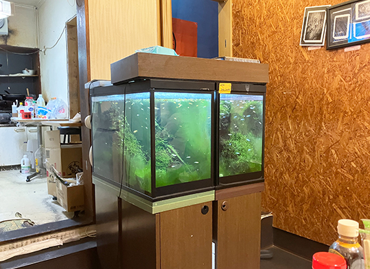 お店はポツンと建っている一軒家で、周りには、他のお店がありません。このため、このお店の明かりが目立っています。店内に入るとカウンターがあって、その奥にテーブル席があります。2階は座敷席になっているようです。