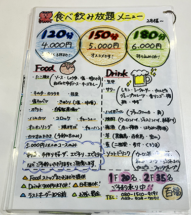 「たこ焼き居酒屋」という店名の通りタコ焼きは12種類あり、それ以外にもメニューが豊富です。私は150分、食べ飲み放題というメニューを予約して訪問しました。150分のコースにすると生ビールが飲み放題になるからです。
