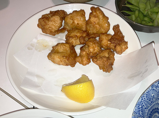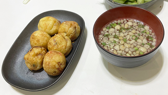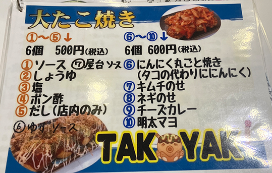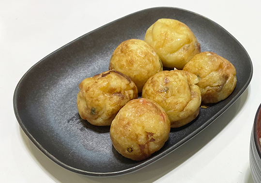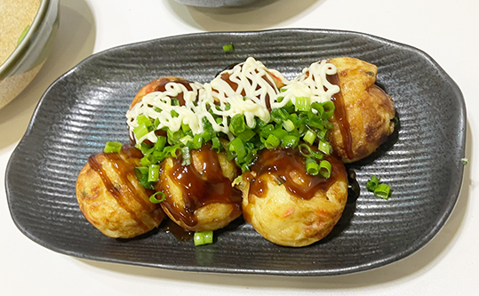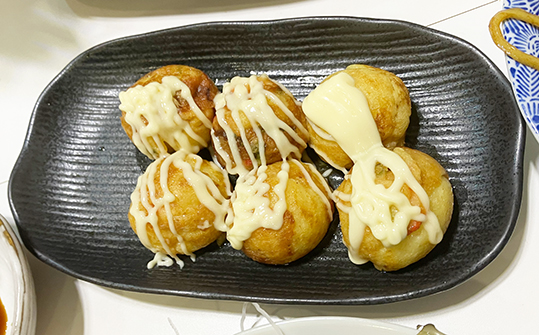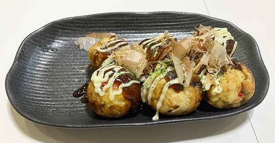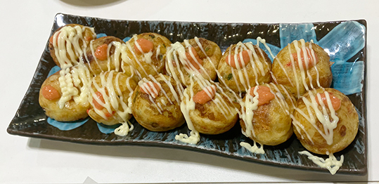 少し、料理の提供をストップしてもらい、食べ、飲み、再開してもらったら、タコ焼きが2種類、提供され、さらに鶏のから揚げ、ポテトフライ、炒飯が出てきました。そして最後に店員さんが、「あとはタコ焼きしか出せませんけど、どうしますか?」と聞いてきたので、『お願いします!』と注文すると、3種類のタコ焼きが提供され、これで料理は終了のようでした。