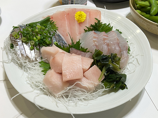 最初に生ビールを注文すると、店員さんに「ハムカツコロッケは何人分にしますか?」と聞かれました。「ハムカツコロッケ」がどんなものか、分からなかったので、とりあえず『人数分、お願いします』と注文しました。そして乾杯したころ、最初の料理であるタコ焼き(にんにく丸ごと焼き)が提供されました。美味しくいただいていると、枝豆が出てきて、そのすぐ後に刺身盛合せが提供されました。タコ焼き屋さんで刺身が提供されるとは思っていなかったので、一同、盛り上がりました。すると続けて、きゅうり、チャーシューが出てきました。これでテーブルが一杯になってしまいました。あまりの早さに一同、驚き、会話もそこそこに食べることに集中しないといけない感じでした。
