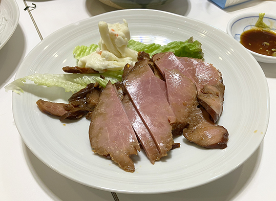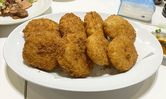 大いに食べ、飲んでいると、そこに「ハムカツコロッケ」が提供されました。何と、ハムカツとコロッケでした。結構な大きさですので、確かに人数の半分でも良かったのかもしれません。でも、初めての人には分からないですよね。ハムカツもコロッケも美味しかったので、みんな満足して食べきりました。