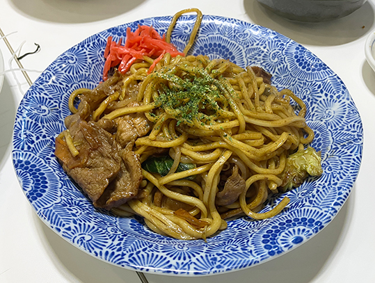 そこにたこ焼き(ネギのせゆずソース)が提供され、さらに鰹のたたきが出てきました。すると2階の御客さんが焼きそばを3人前、注文したらしく、店主さんが「焼きそば、食べます?」と聞いてきました。『お願いします!』と言うと、「何人前?」と聞かれました。量が分からなかったので、無難に『1人前で!』とお願いしました。しばらくして出て来た焼きそばは、確かに1人前という大きさでした。
