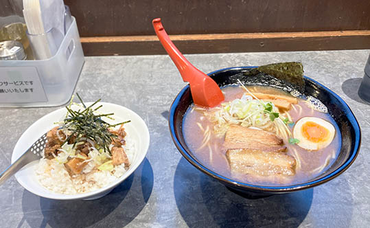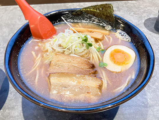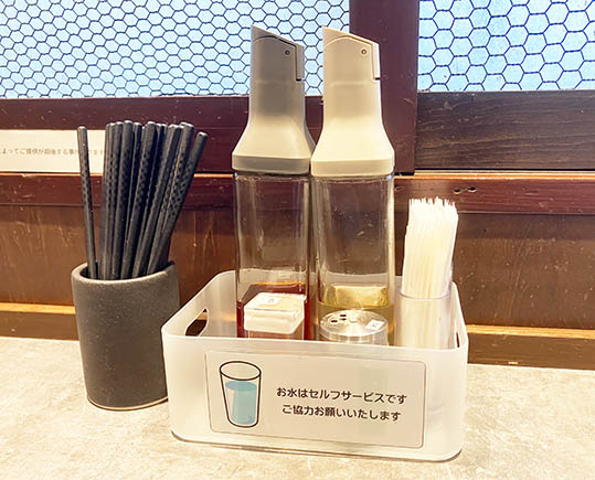 店内に入ると左側に券売機があり、食券を購入します。店内は落ち着いた雰囲気で、自社で内装されたのだろうと思います。カウンター席とテーブル席がありますので1人でも、大人数でも使えるお店です。店内中央には魚粉、ゴマ、柚子胡椒などが置いてあり、自由にトッピングできます。また、スープを温め直せるように電子レンジも置いてあります。